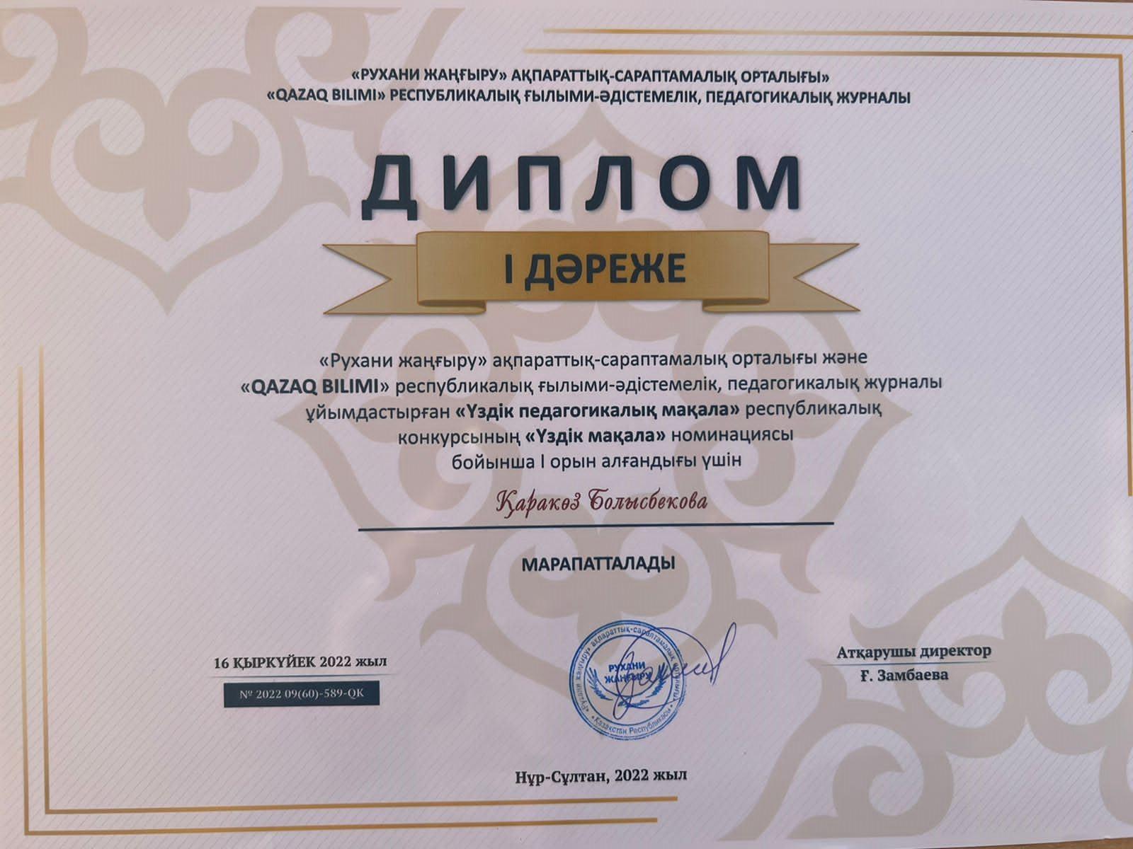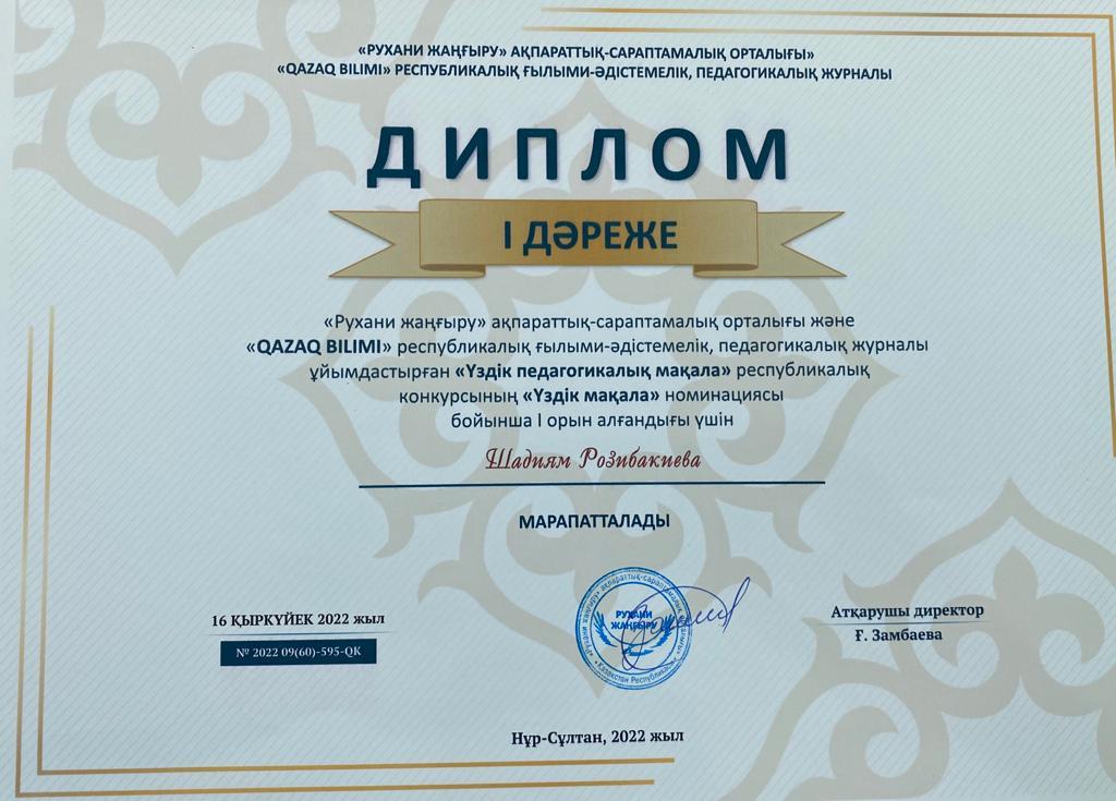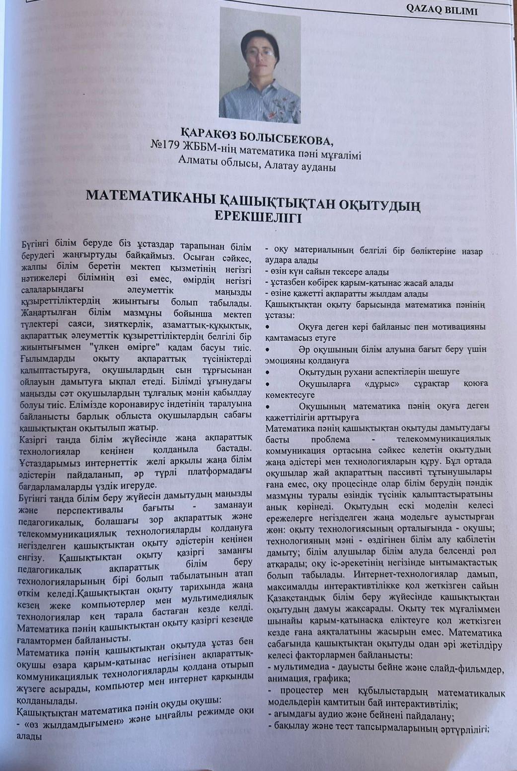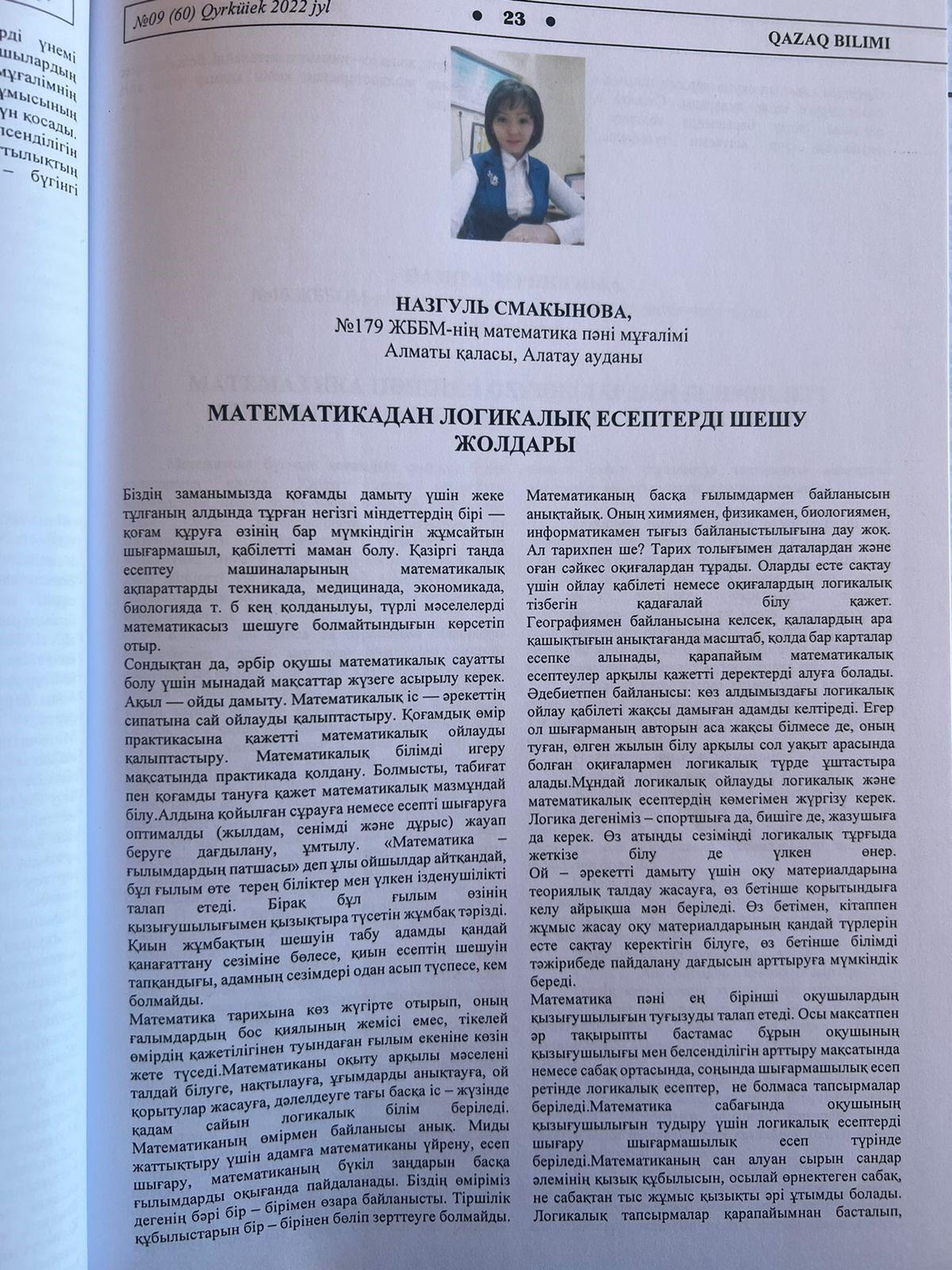«QAZAQ BILIMI» Республикалық ғылыми-әдістемелік, педагогикалық журналы ұйымдастырған «Үздік педагогикалық мақала» Республикалық конкурсының «Үздік мақала» номинациясы бойынша № 179 жалпы білім беретін мектеп ұстаздары, Абдрахманова Рабигуль Рахмахуновна, Розибакиева Шадиям Шарипқызы, Болысбекова Қаракөз Кумарбековна, Смакынова Назгуль Сайлаубековна I- ші дәрежелі дипломмен марапатталып, «QAZAQ BILIMI» журналына мақалалары жарияланды.
