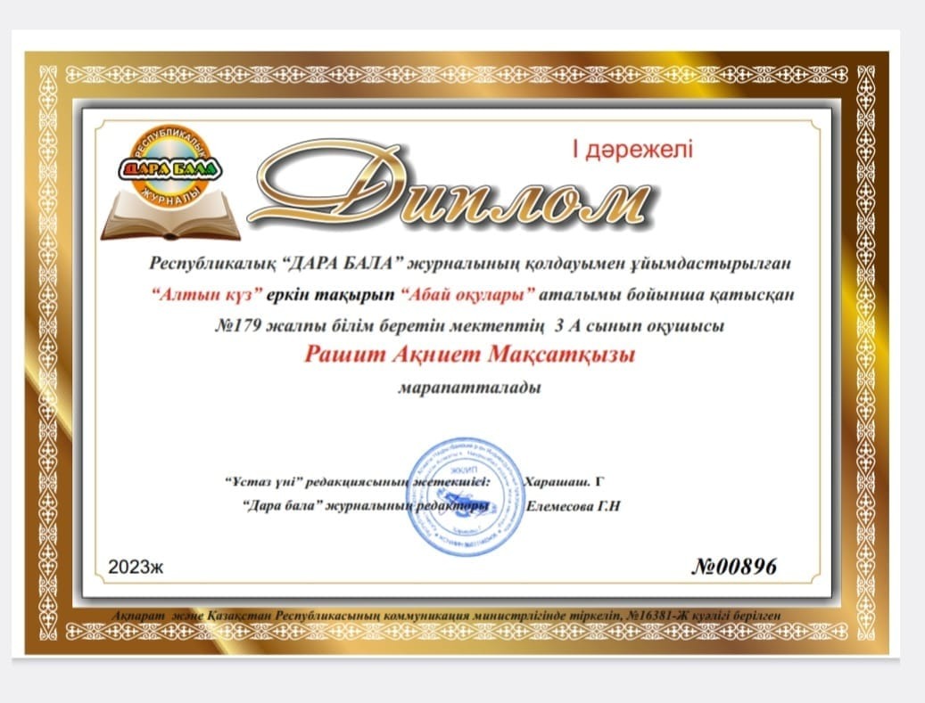 Республикалық "Дара бала " журналының қолдауымен ұйымдастырылған "Алтын күз" еркін тақырып "Абай оқулары" аталымы бойынша қатысқан мектебіміздің 3 "А" сынып оқушысы Рашит Ақниет Мақсатқызы І дәрежелі дипломмен мараппатталды.