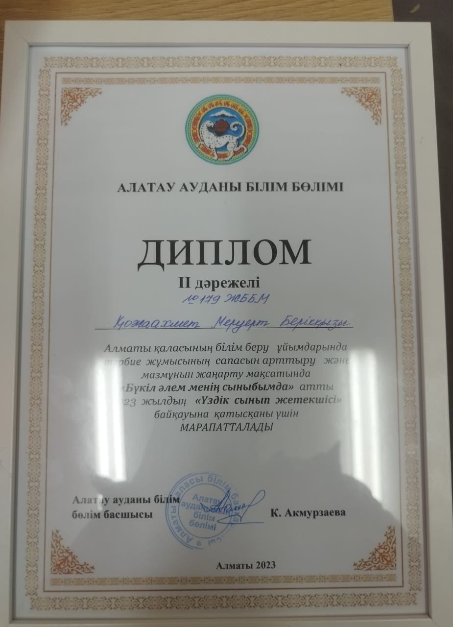Алматы қаласы Алатау ауданы білім беру ұйымдарында тәрбие жұмысының сапасын арттыру және мазмұнын жаңарту мақсатында "Бүкіл әлем менің сыныбымда" атты 2023 жылдың "Үздік сынып жетекшісі" байқауында мектебіміздің бастауыш сынып мұғалімі Қожахмет Меруерт Бейбітқызы жүлделі ІІ дәрежелі ДИПЛОММЕН МАРАПАТТАЛДЫ. ҚҰТТЫҚТАЙМЫЗ