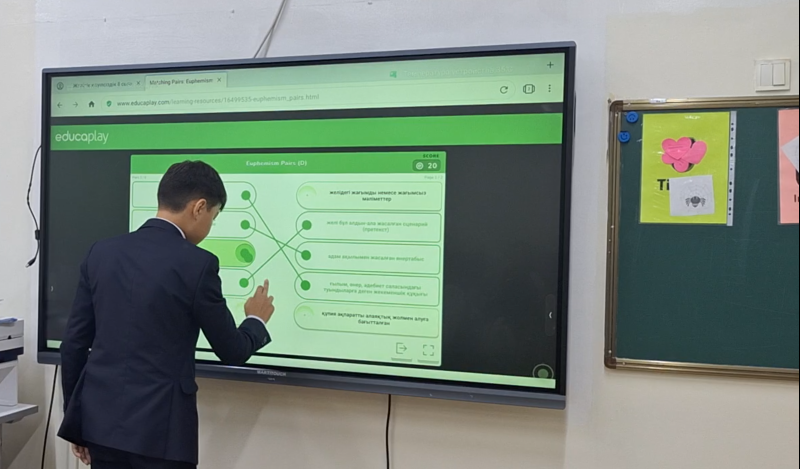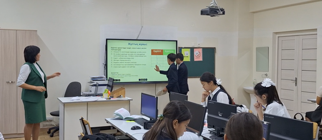 09.10.2024ж күні «Желідегі қауіпсіздік» тақырыбында 8 «А» сынып оқушылармен информатика пәнінен педагог-сарапшы информатика пән мұғалімі Раева Гульвира Рахимовна ашық сабақ өтті. Қоғам қайраткерлерімен таныстыра отырып білім алушылардың патриоттық сезімін оята алды. Оқушыларды сурет қиындыларын біріктіру арқылы екі топқа бөлді. Алдынғы сабақты пысықтау мақсатында «Өрмекші торы» әдісі арқылы жасырылған өрмекшілерді табу арқылы оқушылар сұрақтарға жауап берді. Еducaplay.com платформасы арқылы оқушылармен жеке жұмыс жүргізді.Топтық жұмыс «Компьютерде орындайық» тапсырмасы арқылы орындалды Интернеттің іздеу сайттарын пайдалана отырып, берілген термин сөздеріне анықтама берілді.«Кім жылдам?» әдісі арқылы білімдерін пысықтауда wordwall платформасындағы тест сұрақтарына жауап берілді. Кері байланыс жасауда оқушылар өз топтарына лүпілшелер қойып сабақтан алған әсерлерімен бөлісті.