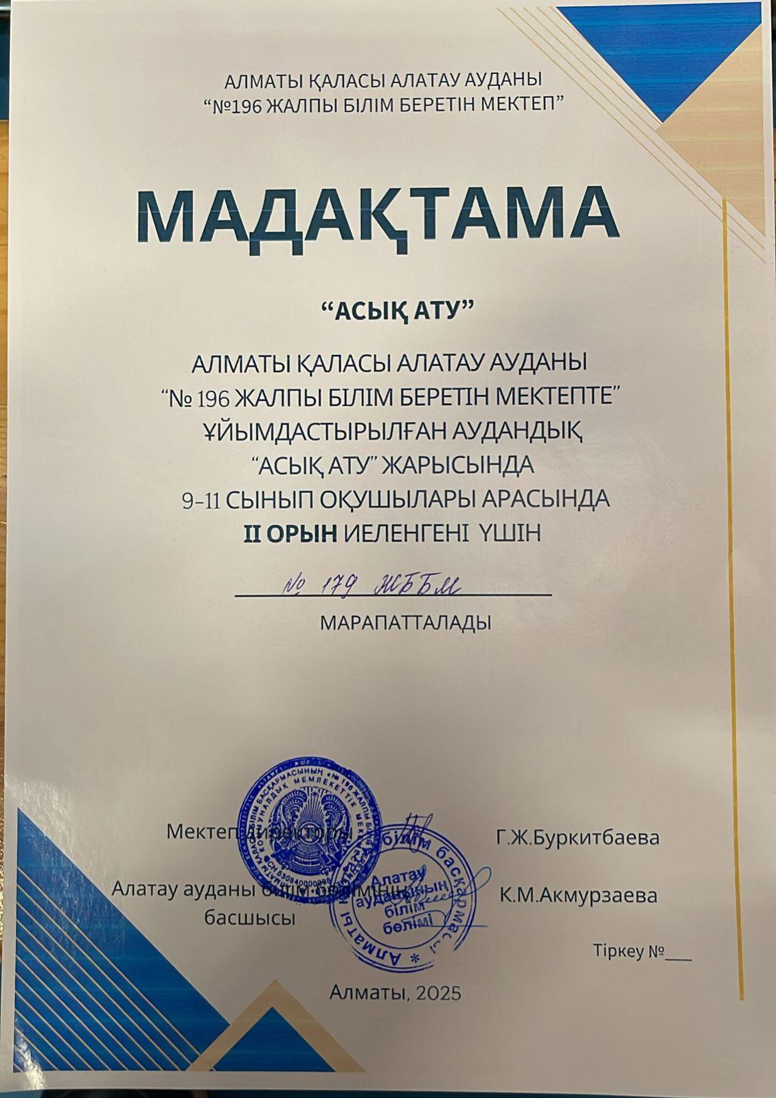22 январь 2025 0 1 2 3 4 5 Аудандық "Асық ату" жарысы Аудандық "Асық ату" жарысында 5-6 сынып І ОРЫН, 9-1 сынып ІІ ОРЫНмен марапатталды. Жетекшілері: дене шынықтыру пәнінің мұғалімі: Таубаев Базарбай Осы беттің QR-коды:QR-код этой страницы: