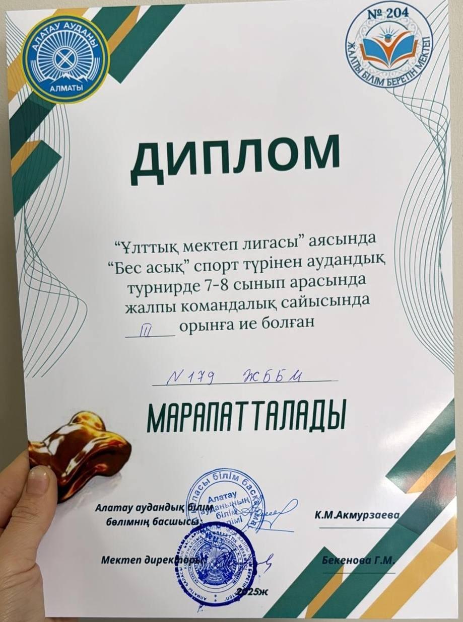 "Ұлттық мектеп лигасы" аясында "Бес асық" спорт түрінен аудандық турнирде 5-6 сынып және 7-8 сынып командалық сайысында мектебіміздің оқушылары ІІІ дәрежелі дипломмен марапатталды.
