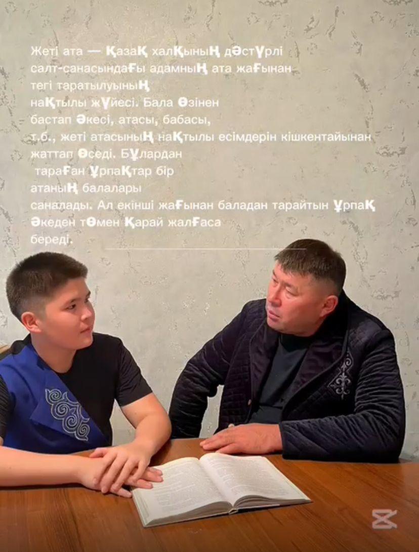 *Адал ұрпақ* ұйымының мүшесі 7 *Г* сынып оқушысы Жабырбай Әмірлан *Жеті атаңды білесің бе?* тақырыбында әкесінің шежіре туралы әңгімесін тыңдап, жеті атасын тергеп әкесінің ақылын тыңдады.