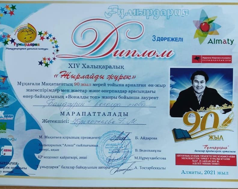 XIV Халықаралық “Жырлайды Жүрек” Мұқағали Мақатаевтің 90 жыл мерей тойына арналған ән-жыр жасөспірімдер мен жастар және өнерпаздар арасындағы өнер байқауының “Вокалды топ” жанры бойынша мектебіміздің 2 “б” сынып оқушылары 3 дәрежелі дипломмен марапатталды. Жетекшісі: Кунхожаева Гауһар Мухамадиевна