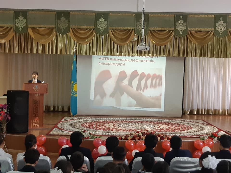 Оқушыларды ғасыр інтеті «СПИД» пен таныстыру, оның пайда болуы мен жұғу жодарымен таныстыру, СПИД тің әлемді жайлап бара жатқаны жайлы біршама мәліметтер беру мақсатында, бүгін 8, 9, 10 сынып оқушыларына "Дені сау ұлт - ұлттың болашағы " тақырыбында, биология пәні мұғалімдерінің ұйымдастыруымен тәрбие сағаты өткізілді.