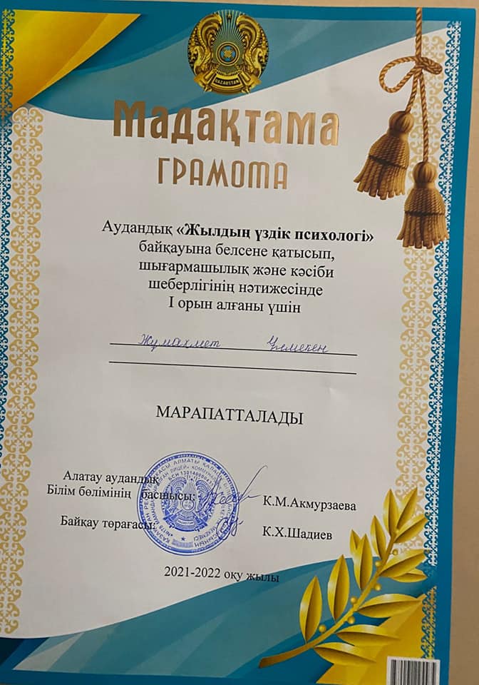 "Жылдың үздік психологі" байқауына белсене қатысып, шығармашылық және кәсіби шеберлігінің нәтижесінде І орынмен марапатталды.