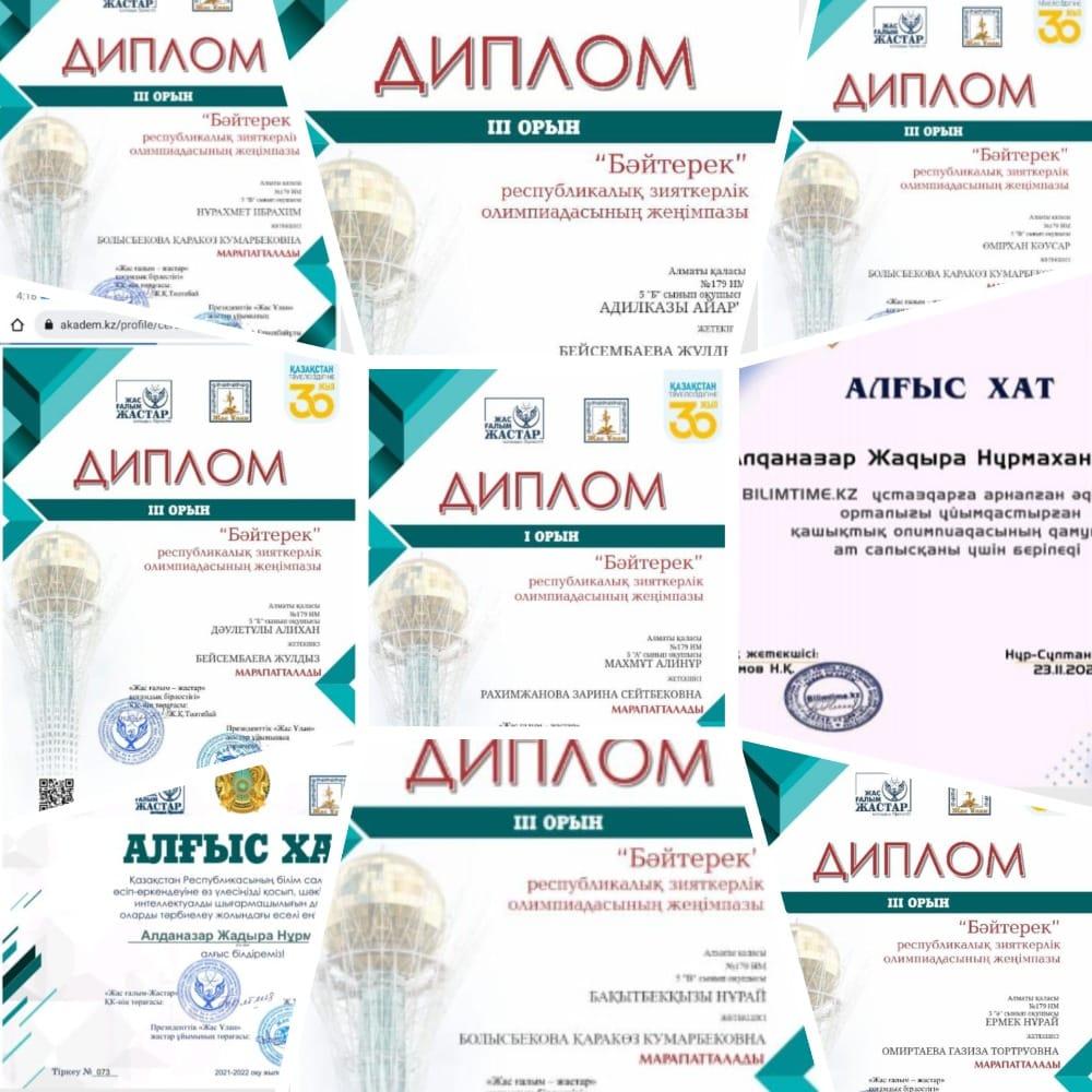 №179 жалпы білім беретін мектептің оқушылар "Бәйтерек " республикалық зияткерлік олимпиадасына қатысып, жүлделі І, ІІ, ІІІ орындармен марапатталды!