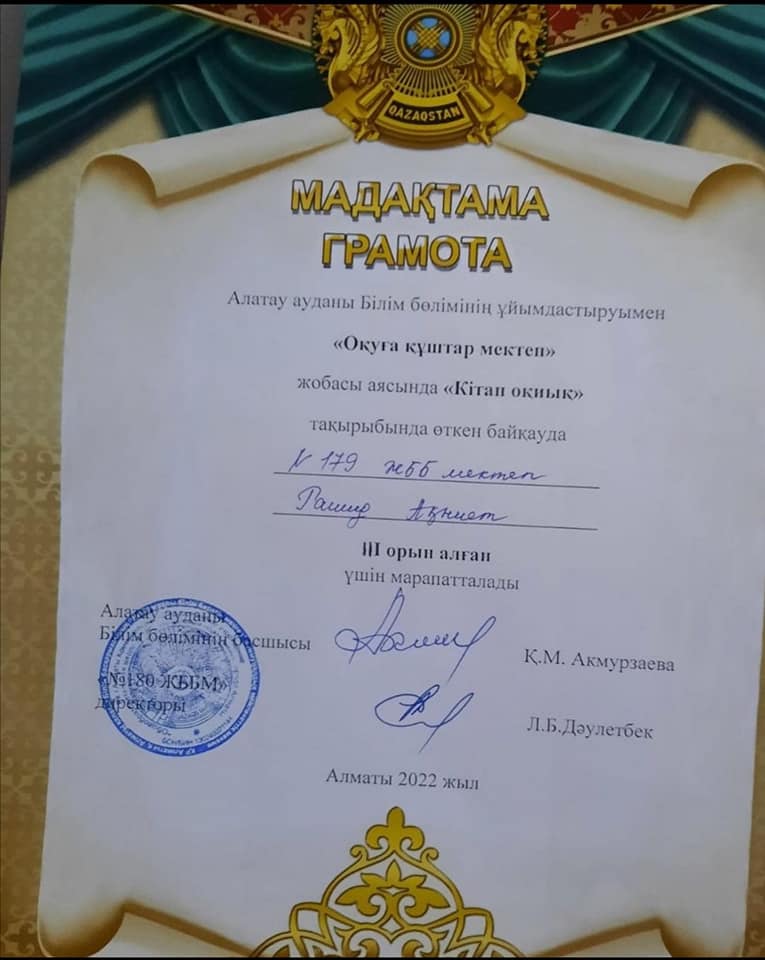 28 февраль 2022 0 1 2 3 4 5 "Кітап оқиық" №179 жалпы білім беретін мектеп 1 «А» сынып оқушысы Рашит Ақниет Алатау білім бөлімінің ұйымдастыруымен өткізілген "Кітап оқиық" байқауына қатысып, жүлделі III орынмен марапатталды. Осы беттің QR-коды:QR-код этой страницы: