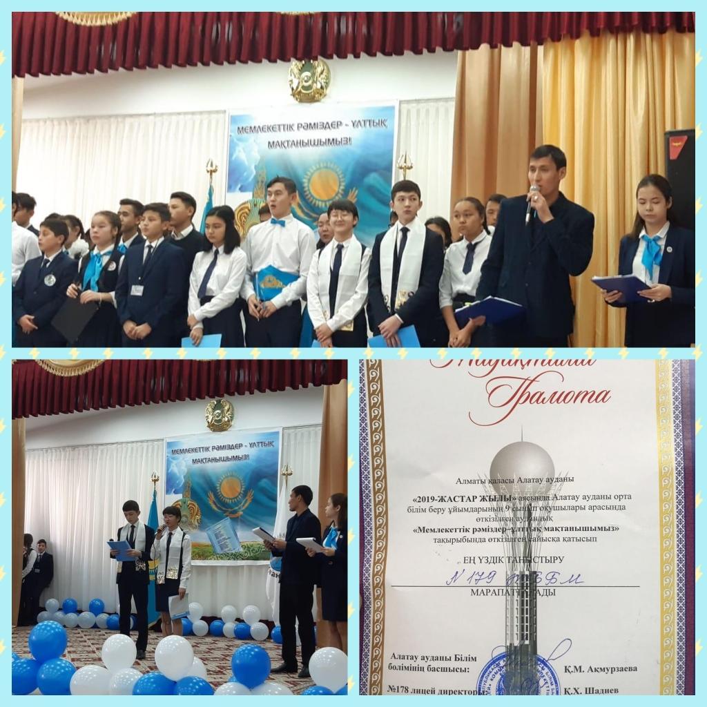 2019 жыл 9 қарашада "2019- Жастар жылы" аясында Алатау орта білім беру ұйымдарының 9 сынып оқушылары арасында "Мемлекеттік рәміздер - ұлттық мақтанышымыз " тақырыбында