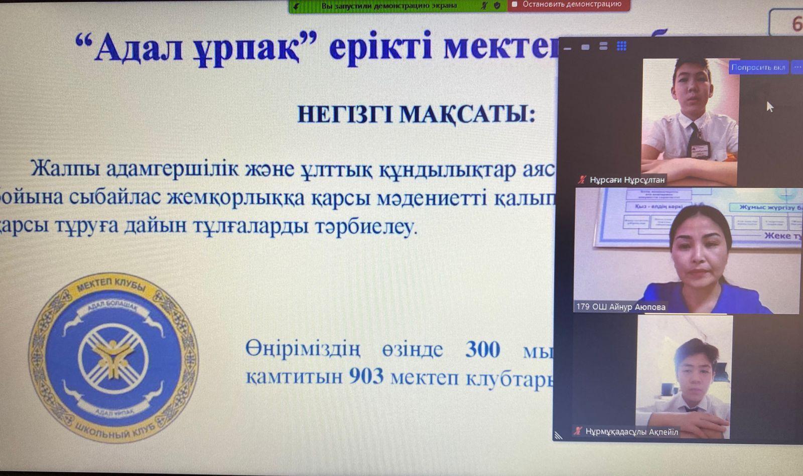 "Адал ұрпақ - ел болашағы" Еліміздің болашағы жалынды жастар қолында. Оқушылардың еліне, мемлекетке деген адалдық сезімін қалыптастыру мақсатында мектебімізде "Адал ұрпақ" ұйымының кезекті отырысы қашықтықтан өткізілді. Ұйым мүшелері "Адал ұрпақ" ұйымының мақсаты мен міндетін талқылап, атқарылатын іс-шаралар туралы пікір алмасты.