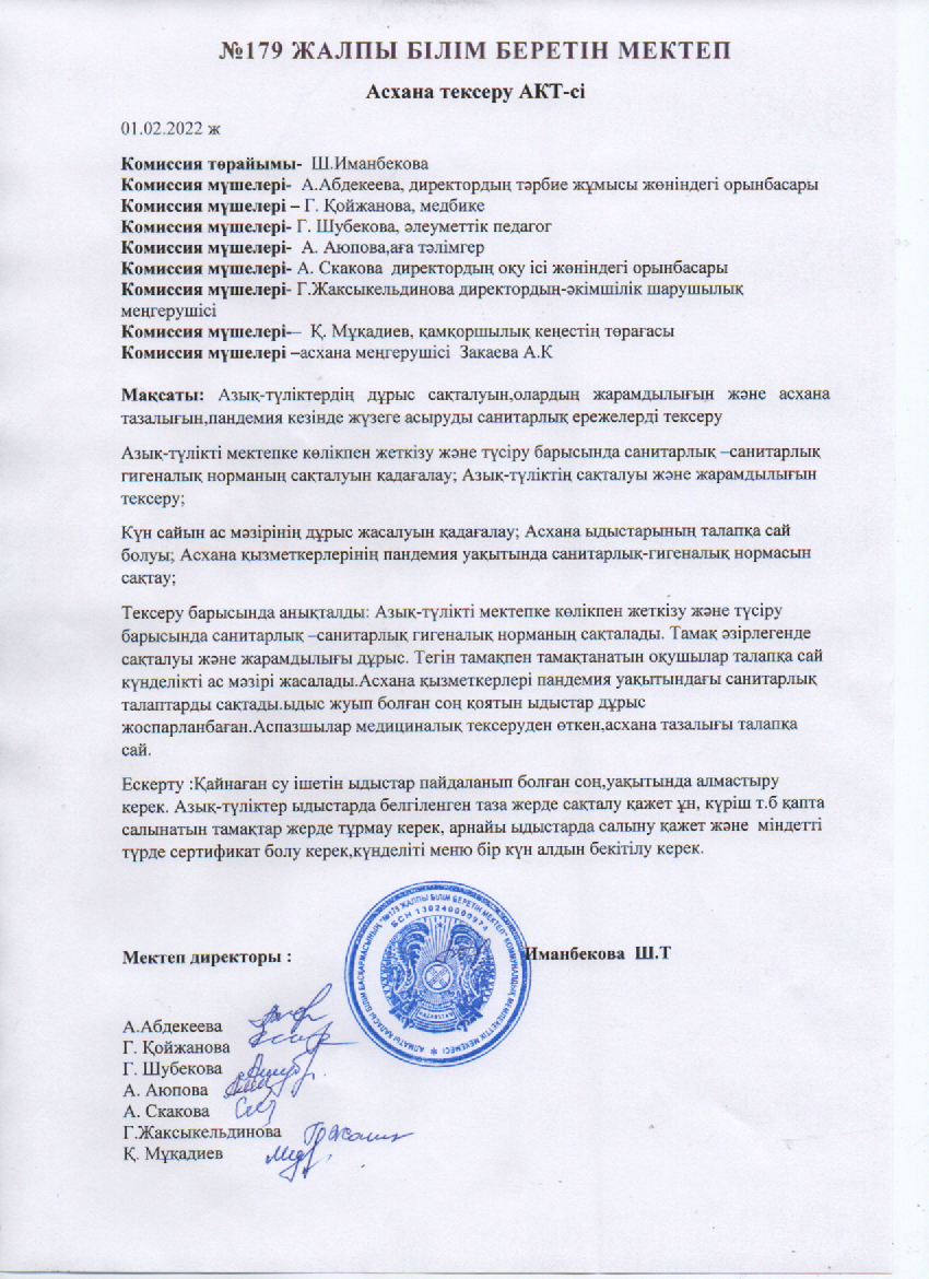 "Мектеп асханасының дайындығын тексеру" АКТ-сі