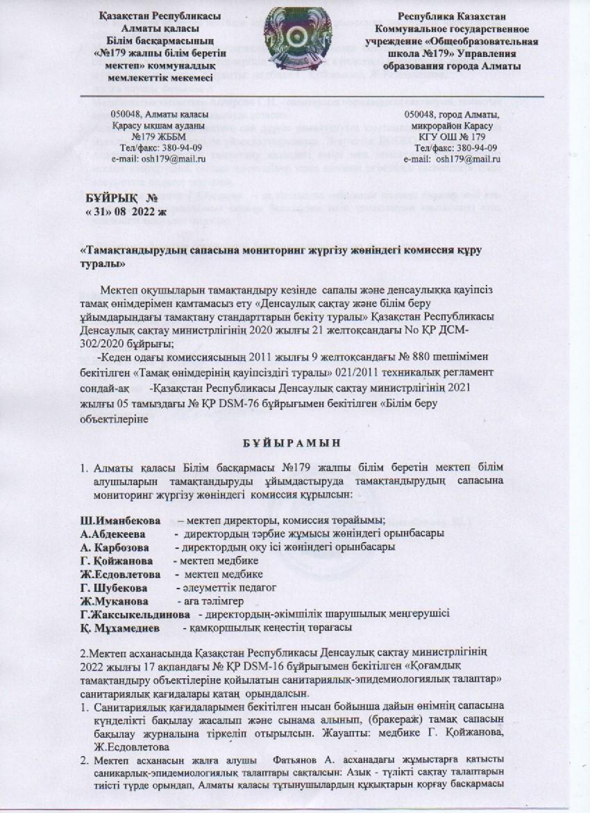 09 сентябрь 2022 0 1 2 3 4 5 Тамақтандырудың сапасына мониторинг жүргізу жөніндегі комиссия құру туралы БҰЙРЫҚ Осы беттің QR-коды:QR-код этой страницы: