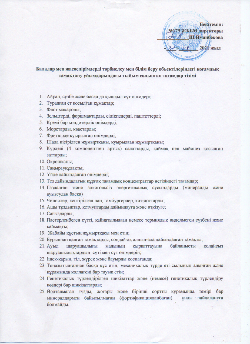 09 февраль 2022 0 1 2 3 4 5 Балалар мен жасөспірімдерді тәрбиелеу мен білім беру объектілеріндегі қоғамдық тамақтану ұйымдарындағы тыйым салынған тағамдар тізімі Осы беттің QR-коды:QR-код этой страницы: