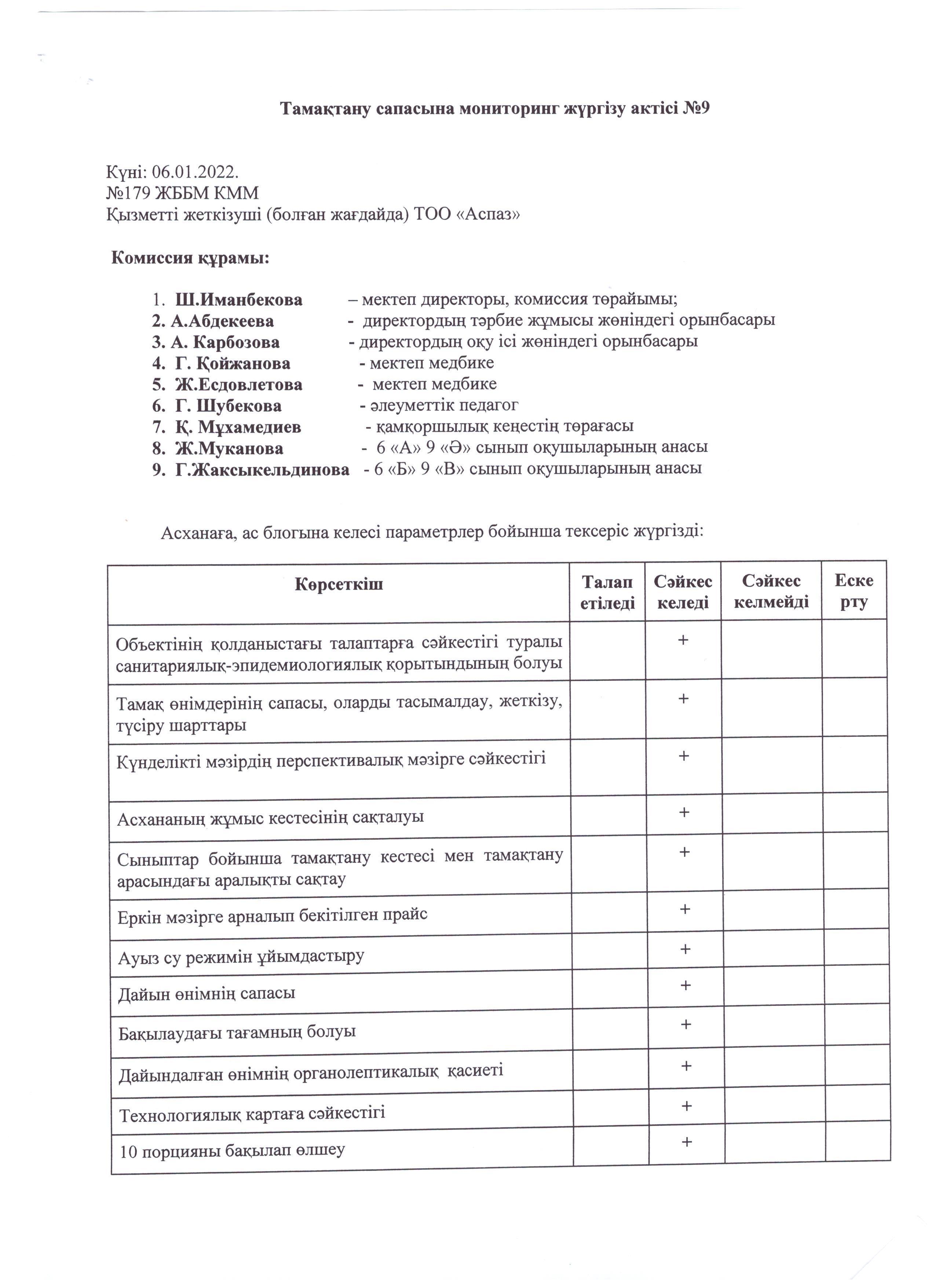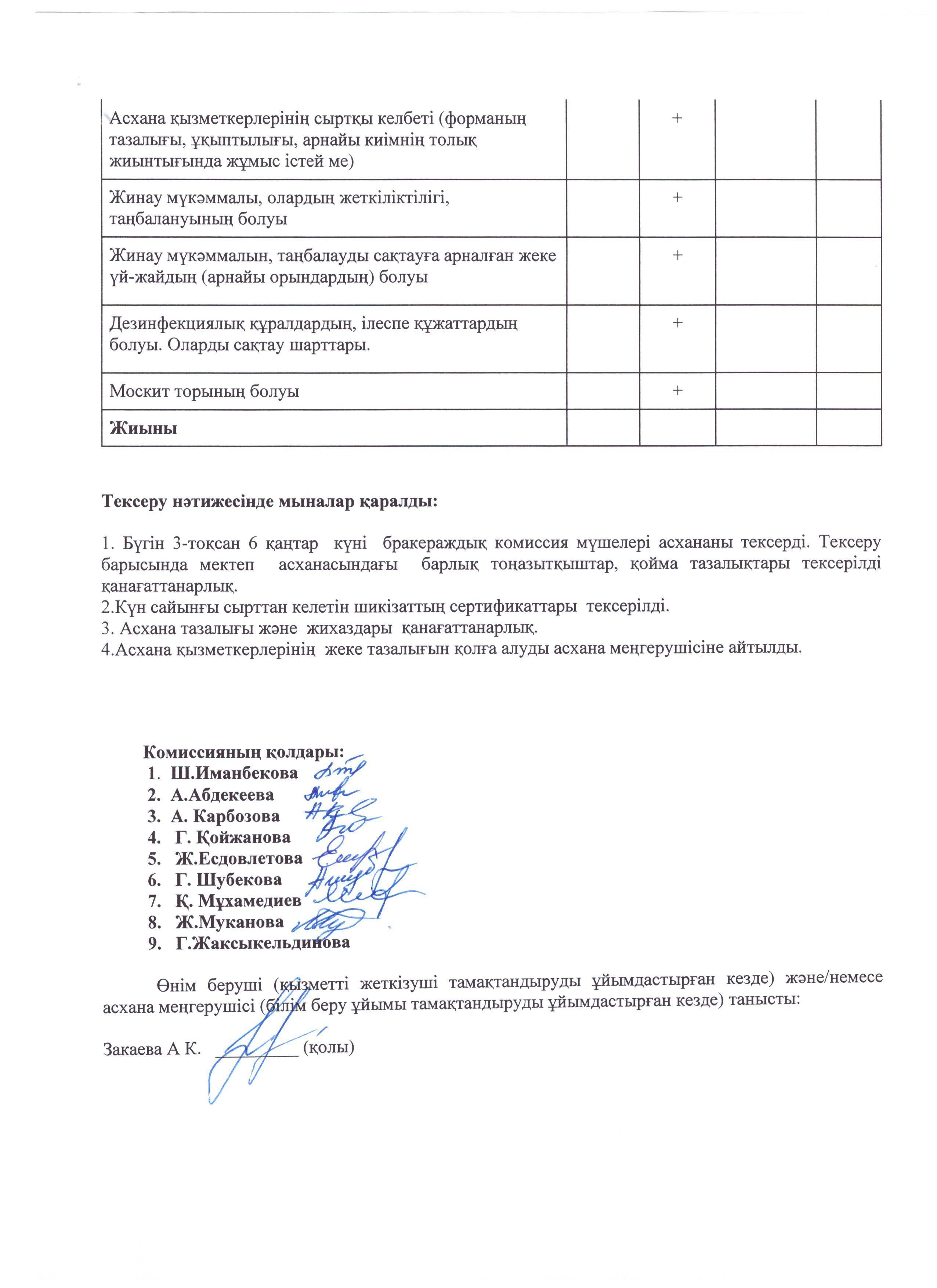 Тамақтану сапасына мониторинг жүргізу жөніндегі комиссия жұмысының қорытындысы.